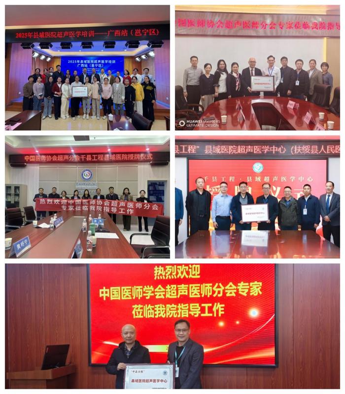 理论联系实际,下沉更要扎根。当天下午,由何文教授、朱家安教授、杨红教授等多位专家领衔的五支精英教学团队,分赴邕宁区人民医院、扶绥县人民医院、隆安县人民医院、宾阳县人民医院及南宁市第十人民医院开展实地调研与床边带教。在各帮扶医院现场,举行了“中国医师协会超声分会千县工程县域医院授牌仪式”,为这些县域医院授予了权威认证,标志着我院作为区域技术指导单位与各受援医院建立了规范化的对口帮扶关系与长效协作机制。专家们深入科室,了解实际需求,针对操作规范、诊断思路、报告书写等具体环节进行“手把手”指导,确保培训成果能直接转化为基层医师的日常实践能力。