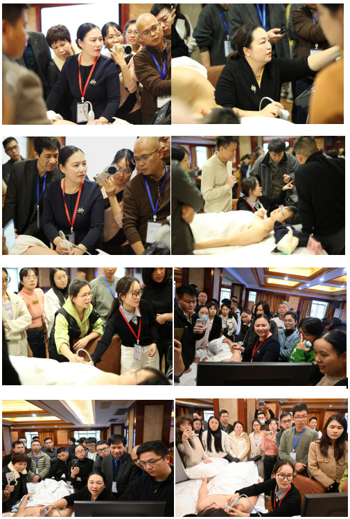 实践操作环节,我院疼痛科副主任张光英主任医师,疼痛科利莉主任医师、黄桂丽住院医师对头颈部、面部、上肢各关节肌骨超声及上肢神经超声进行现场超声实操演练,学员们在我院带教老师“手把手”指导下,从探头的持握、声像图的优化调节到穿刺路径演示,分组进行肌骨超声现场观摩学习与实操,学员们热情高涨并积极提问,现场互动频繁,教学效果良好。学员们表示,这种“即学即练”的模式能有效加深对理论知识的理解,提升了实际操作的手感和信心。
