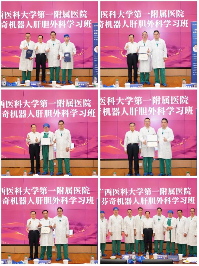 12月14日,机器人普通外科手术学习班通过线上线下的方式如期举行,学习班邀请到了深圳大学第一附属医院肝胆胰外科詹勇强主任和詹乃洋教授、中南大学湘雅二医院桂林医院普外一病区张涛主任、空军军医大学唐都医院普外科阴继凯教授、成都市第三人民医院普外科肝胆胰外科病区负责人文君教授、玉林市第一人民医院肝胆外科庞志东主任及广西医科大学第二附属医院肝胆胰外科姚明教授参与线下交流座谈及手术参观学习。在简短的开幕式及座谈交流环节后,通过线上直播的形式展示手术的全过程和关键技术操作,吸引众多普外科医学同道交流学习。在我院肝胆外科、麻醉手术室医护团队的密切配合下,肝胆外科余水平主任医师主刀机器人辅助下左半肝切除+胆囊切除术、机器人辅助下左半肝切除+胆总管切开探查+T管引流共两台手术,肝胆外科陆世鎏医师和袁观斗医师担任助手,卢榜裕教授担任线上手术解说。在专注操作的同时,余水平主任医师还时不时讲解手术细节和难点,分享技术要领和技巧,并在术后进行《第4代达芬奇机器人在右半肝切除术中的策略》专题经验分享,为线下参加培训的学员颁发培训证书。