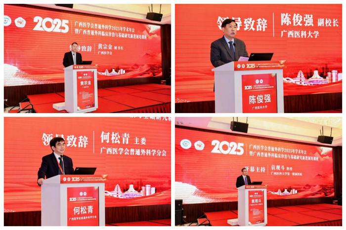 12月13日上午,会议在南湖名都大酒店正式开幕,广西医学会普通外科学分袁观斗秘书主持开幕式。广西医学会秘书长黄宗金对会议的召开表示祝贺,并对普外分会多年来的工作给予了高度评价,希望通过年会进一步加强广西与国内外普外领域的交流与合作,不断提升广西普外医学的整体水平。广西医科大学副校长陈俊强强调普通外科在向精准化、智慧化、集成化转型中的重要意义,高度肯定了广西普通外科取得的特色优势和规范化建设成就,勉励广大同道特别是青年医师立足广西、拥抱人工智能等新技术,在传承中创新,在融合中发展,为推动广西普通外科高质量发展和人民健康福祉作出更大贡献。广西医学会普通外科学分会主任委员何松青教授回顾了广西普外科通道在既往取得的工作和成绩并给予高度评价,同时围绕本次会议的主题,简要介绍了本次大会在基础研究、临床进展、机器人手术和AI应用等方面的重点内容和丰富日程,充分体现了推动广西普通外科学向专科化、规范化、精准化发展的信心与担当。