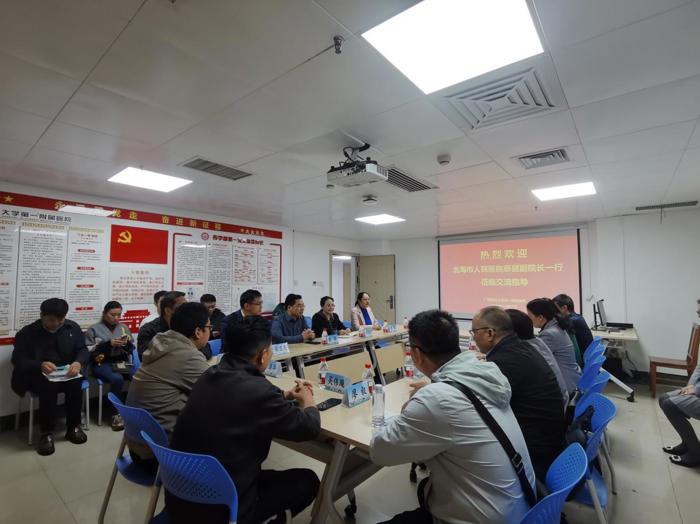 黄锋首先代表医院对北海市人民医院同仁的到来表示热烈欢迎。他表示,两院长期以来保持着良好的合作关系,此次专题交流聚焦药学服务创新与智慧化建设,有助于共同探索新时期医院药学高质量发展的新路径。蔡健介绍了此次来访的目的,希望深入了解我院在人工智能应用、新制剂研发及药房精细化管理等方面的实践经验。