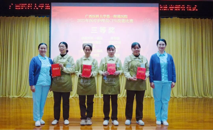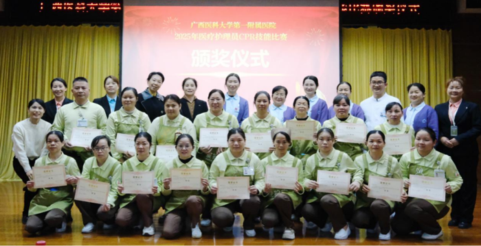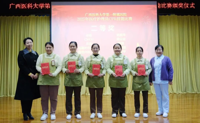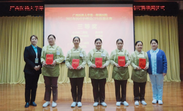 经过激烈角逐,本次CPR急救技能比赛共评选出一等奖3名、二等奖5名、三等奖10名。医院护理部与广西新生活公司相关领导共同为获奖选手颁发荣誉证书,并合影留念,向获奖人员表示祝贺。