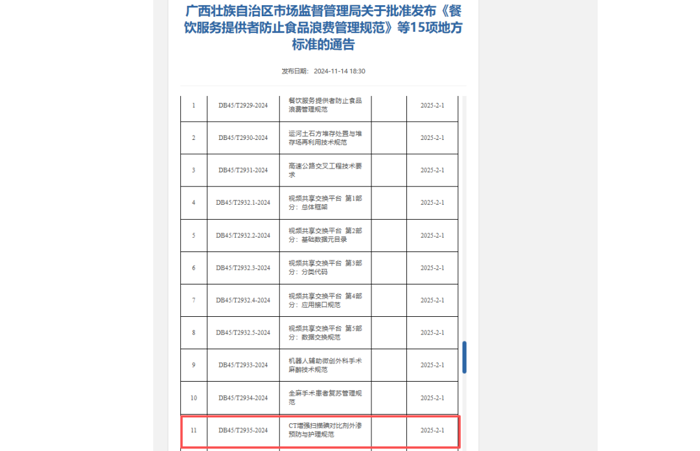 2024年11月14日,广西壮族自治区市场监督管理局正式发布广西首部影像护理类地方标准《CT增强扫描碘对比剂外渗预防与护理规范》(DB45/T2935-2024)。该标准已于2025年2月1日起正式实施。标准对标国家于2024年4月30日正式下发的医疗质控指标(2024年版)要求的国家放射影像质控指标⑤——“增强 CT 检查静脉对比剂外渗发生率(RQI-ICME-01)”,并将其列入《放射影像专业医疗质量控制指标(2024 年版)》核心监测项。