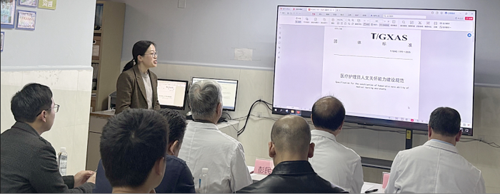 针对当地医院肝胆外科科研经验欠缺的短板和临床研究急切提升的需求,彭民浩教授围绕当前医学发展趋势和肝胆外科的前沿技术进行讲解,重点指出微创手术、人工智能、转化医学在肝胆外科的应用前景。我院专家团队发挥临床教学优势,为当地医院示范了经典的教学查房和疑难病例讨论会,专题介绍了不可切除肝癌转化治疗的方法并通过肝癌转化实战病例手把手传授转化治疗的技巧。我院陈冬梅副主任护师还向当地医院护理人员讲授了《医疗护理人文关怀建设规范》团体标准。