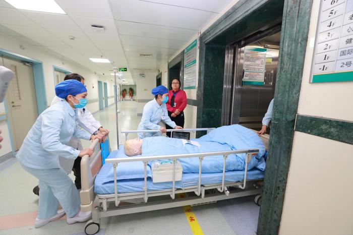 复苏成功后,演练立即转入ICU转运环节。团队分工明确、忙而不乱:医生实时评估转运指征、与家属沟通并联系ICU及电梯待命;护士快速准备转运急救药品、用物、设备及患者病历、研究文件夹等资料。转运全过程用时6分钟,高效流畅。