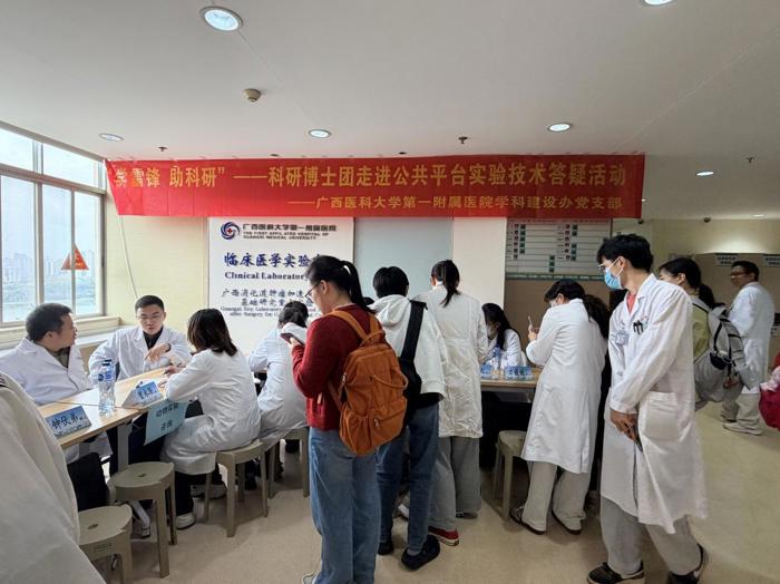 3月17日下午,我院学科建设办公室党支部在临床教学大楼13层大厅组织开展“学雷锋助科研——科研博士团走进公共平台实验技术答疑活动”,由学科建设办公室副主任李若林博士、钟伏弟博士、桂滢博士等经验丰富的指导老师带队组建科研博士团,为全院科研人员提供精准高效的一对一技术指导,打通科研实验“堵点”,助力科研提质增效。