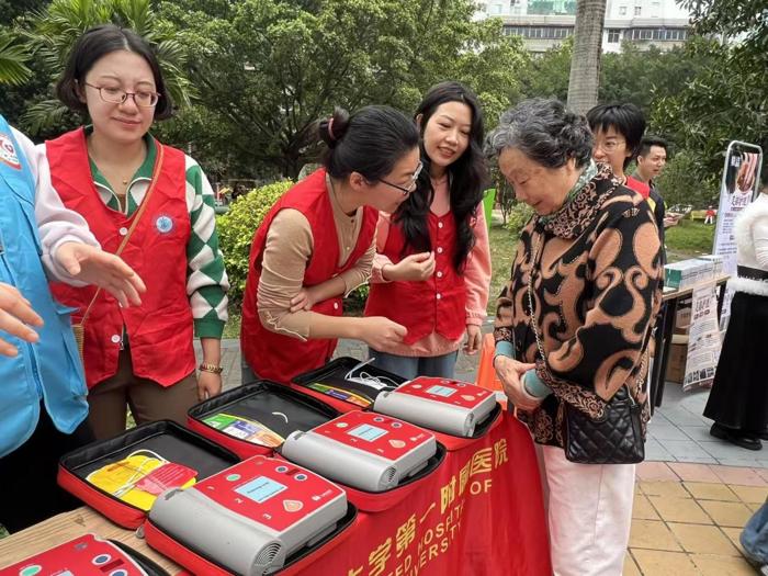 随后,实操演练环节有序展开。现场设置了心肺复苏(CPR)、AED使用、海姆立克急救法三个站点,在党员医护人员及学生临床技能协会成员们的指导帮助下,利用模拟人练习胸外按压的操作要领,通过训练机熟悉AED的使用步骤,并在互动中掌握海姆立克急救法的“剪刀石头布”定位手法。手把手教学、耐心细致的指导,让居民们在实践中切实提升了自救互救能力。