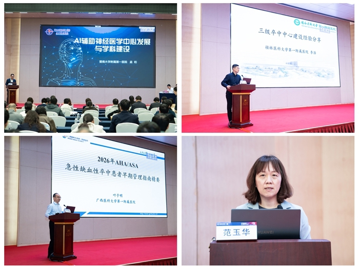 会议特邀国内外知名专家学者莅临授课,开展高水平学术分享。广西神经系统疾病医疗质量控制中心主任、我院神经内科主任吴原教授率先致辞,并对2026年度全区神经系统疾病质控及脑卒中防治重点工作进行部署。随后,国外专家Patrick Lyden教授分享国际卒中治疗领域最新研究进展(杨龙秀担任翻译);中山大学附属第一医院范玉华教授深度解读轻型卒中诊疗指南核心要点;暨南大学附属第一医院孟珩教授作《AI赋能神经医学中心发展与学科建设》前沿专题报告;聊城市人民医院刘卫东教授分享卒中中心绿道建设的实践经验与宝贵成果。我院叶子明教授详细解读《2026年AHA/ASA急性缺血性卒中患者早期管理指南》核心精要;桂林医科大学第一附属医院李浩教授、武宣县人民医院庾佳南院长分别分享三级卒中中心标准化建设经验、二级医疗机构脑卒中防治工作实践心得。