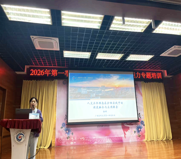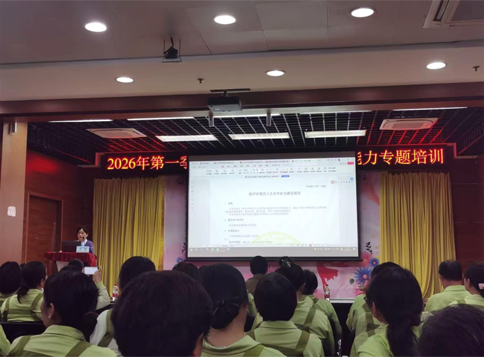 3月23日下午,我院护理部在职工食堂二楼多功能厅举办2026年第一季度医疗护理员人文关怀专题培训。护理部副主任黄德斌、妇产科科护士长余丽出席,新生活公司经理陆丽芬及近80名医疗护理员参加培训。护理部干事方建冰主持。