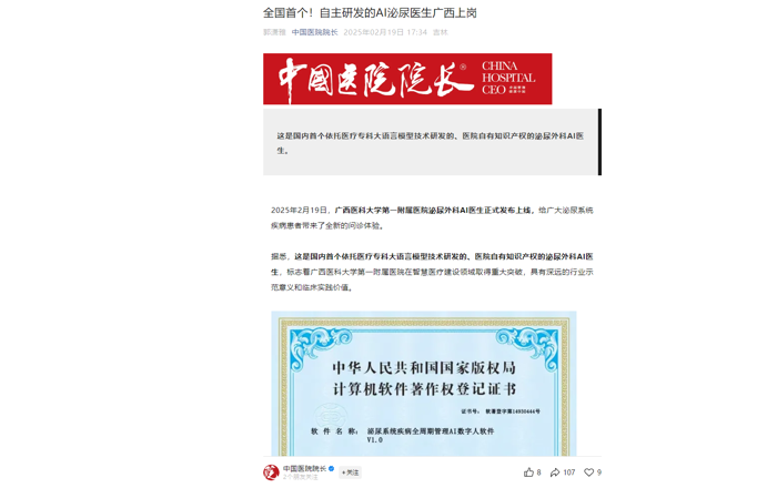 2.AI医生上线了!广西医大一附院泌尿外科AI医生提供全天候专业服务 |医师报·理事会