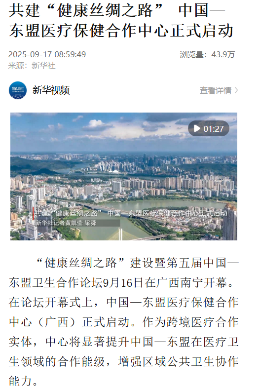 1.新华社:共建“健康丝绸之路” 中国—东盟医疗保健合作中心正式启动