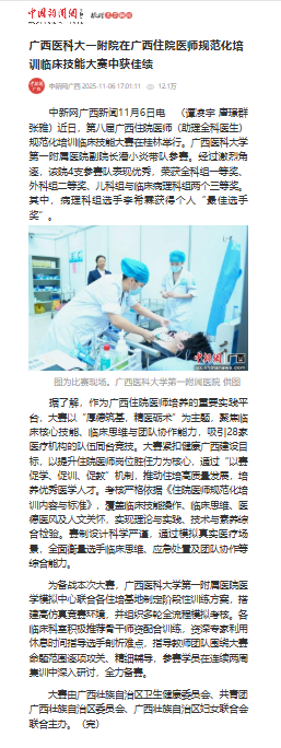 中国新闻网:广西医科大一附院在广西住院医师规范化培训临床技能大赛中获佳绩https://m.chinanews.com/wap/detail/chs/zw/6382773hewtmkwdf.shtml中新网广西新闻11月6日电 (...