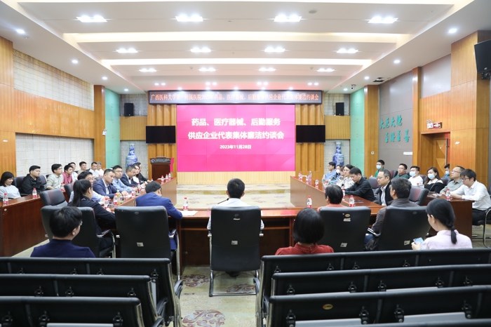 随后,药学部、医疗设备科、后勤办公室等归口采购管理部门负责人也对各供应企业业务往来提出工作要求和建议。国药控股广西有限公司等4家供商企业代表还进行了表态发言,他们表示要严格遵守国家法律法规和行业规范,遵守医院相关流程和管理规范,积极配合医院各项工作,保证药品、医疗器械、后勤服务的供应质量,做到诚信廉洁经营,共同营造风清气正的医疗购销环境。