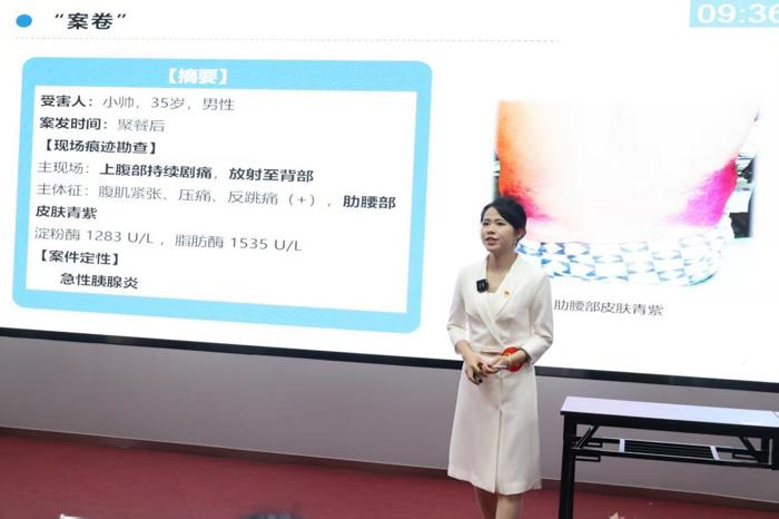 梁春梅以“急性胰腺炎”为授课主题,通过中青年患者聚餐后突发难忍腹痛的病例,设置探案任务与学生开展推理互动,围绕“病因-消化酶异位激活机制-临床表现”阐明该疾病的病理生理过程,并使用实物模型演示与智能体助教,递进式达成知识、能力传递的目标,深度融合课程思政,感召学生成为有温度的医生。