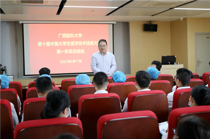 2月17日上午,广西医科大学校长赵劲民、副校长伍伟锋,以及党(校)办、教务处等学校相关部门负责人到第一临床医学院临床技能中心看望我校第十届中国大学生医学技术技能大赛培训团队。第一临床医学院院长陈俊强、副院长郑宝石、教务部副部长韦秋文等陪同。
