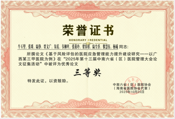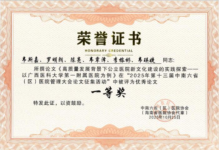 此次获奖是对我院管理创新实践与学术研究水平的充分肯定。我院将以此为契机,持续深化医院管理改革实践与研究,推动创新成果转化,为守护人民健康、助力健康广西建设贡献更多“一附院力量”。