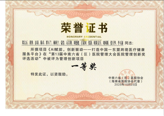 在医院管理创新奖评选中,由我院院长郑宝石、副院长黄锋、彭涛团队主笔的案例《AI赋能,创新驱动——打造中国—东盟跨境医疗健康服务平台》,凭借对人工智能技术的创新应用、对面向东盟的跨境医疗服务模式的突破性探索,获一等奖。该平台聚焦中国—东盟医疗健康合作需求,以信息化为桥梁打破地域壁垒,为面向东盟的跨境医疗服务提供了“广西方案”,得到评审专家的高度认可。