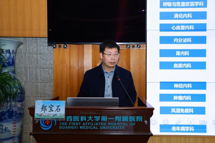 郑宝石致欢迎词并代表我院汇报申请事项及医疗机构执业情况。他表示,作为广西医疗卫生事业的排头兵,我们始终坚持依法执业,践行人民至上初心使命,严格遵循《医疗机构管理条例》,全力守护八桂人民的健康。此次现场审查,既是对我院的全面检验,更是一次查找差距、改进提升的宝贵机会。我院将积极配合审查工作,对发现的问题立行立改,全面提升医院的治理能力和服务水平。