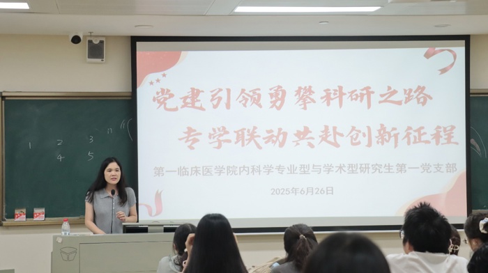 6月26日,第一临床医学院内科学学术型与专业型研究生第一党支部在学校卓越楼5教室开展“党建引领勇攀科研之路,专学联动共赴创新征程”主题党日活动。学院组织员赵春玲、内科学专业型与学术型研究生第一党支部全体党员共70多人参加。