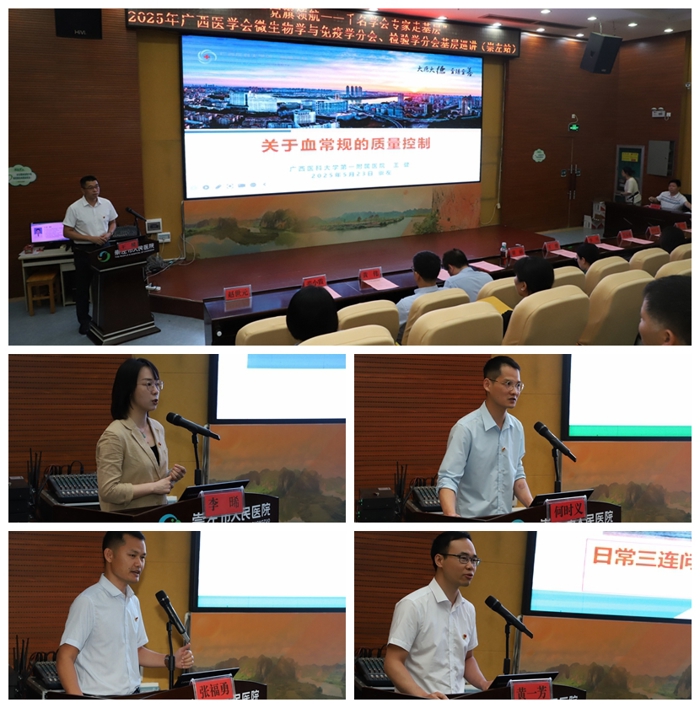 在基层巡讲活动上,黄斌致辞介绍了医院的基本情况,强调了医学检验在疾病诊疗和医院高质量发展中的重要作用,并感谢专家团队的到来。我院检验科王健、李晞、张福勇、黄一芳以及广西医科大学第二附属医院何时义等专家分别作《关于血常规的质量控制》《卫生行业标准在临床实践中的应用》《我如何开展临床沟通——以出凝血疾病的实验室诊断为例》《那些年,与我们擦肩而过的科研题目——浅谈如何从工作中凝聚科研思路与课题》《利用临床检验数据发表SCI论文经验交流》专题报告,从不同角度深入浅出探讨了临床检验和科研问题,广受好评。