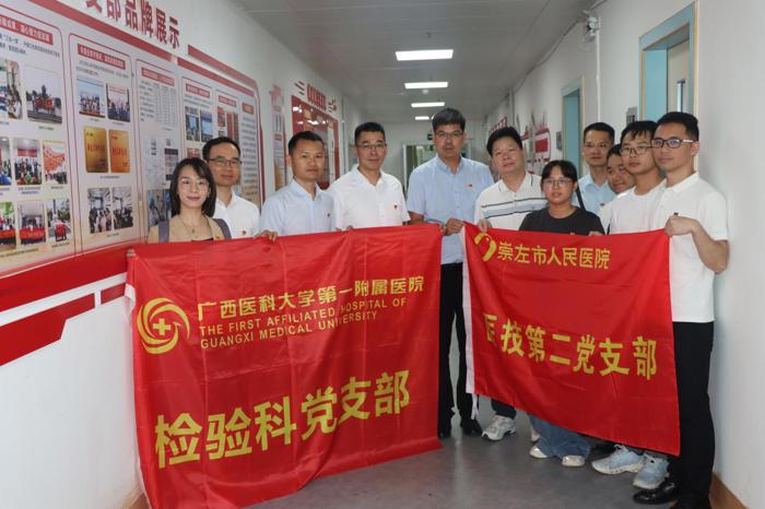 5月23-24日,在检验科党支部书记王健带领下,我院检验科、临床检验诊断学研究生党支部联合到崇左开展医学检验技术对口帮扶走基层暨“重温红色记忆,凝聚奋进力量”主题党日活动。崇左市人民医院副院长黄斌、双方相关党支部书记、支委出席相关活动,崇左市、区县各级医疗机构临床与检验技术人员100余人参加培训。