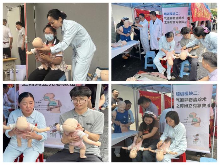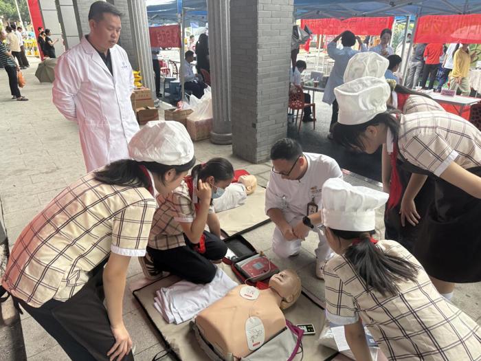 活动现场,急诊科李勇副主任医师和梁政副主任护师以简洁明了的“看叫叫按吹除”六字口诀,深入浅出地讲解了“心肺复苏术+AED”的相关知识。黄霜霞科护士长和钟娟护士长则巧妙地利用“剪刀、石头、布”的游戏形式,生动有趣地介绍了“气道异物清除术之海姆立克急救法”的步骤和技巧,并通过模拟人进行实际操作培训。