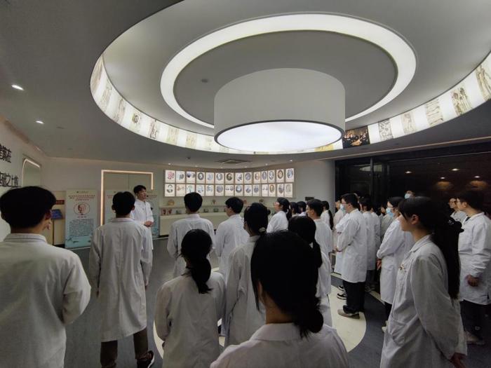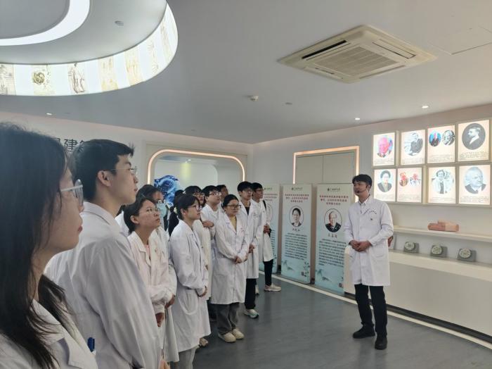 在生命科学馆,全体支部成员身着白袍,在基础医学院人体解剖学教研室党支部老师韦灿燊的讲解下,感悟“大体老师”以身躯铺就医学之路的无私大爱。“他们静默无言,却教会我们最深刻的敬畏。”郭德林教授的故事让大家动容——这位毕生躬耕医学教育的老教授,在生命终点选择以“永恒站立”的姿态化作教学骨架,用另一种方式延续师者使命。全体党支部成员进行了医学誓言宣誓,句句誓词在馆内回响,赤诚初心与前辈精神共鸣。