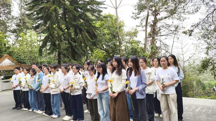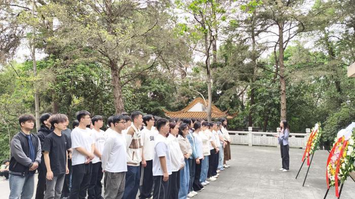 在广西学生军抗日烈士纪念碑前,全体党员庄严肃立。学生第六党支部书记、学工部曹馨予老师进行现场教学,讲述了1938-1941的四年中,广西学生军大力开展抗日救亡宣传活动,以寡敌众、血战昆仑关的英雄事迹。当听到这群平均不到20岁的青年学子投笔从戎、以身殉国的壮烈故事时,在场党员无不动容。随后,党员们重温入党誓词,铮铮誓言在纪念碑前久久回荡;齐声高唱《歌唱祖国》,激昂的歌声传递着新时代青年的爱国热忱;敬献菊花,寄托对革命先烈的深切缅怀。