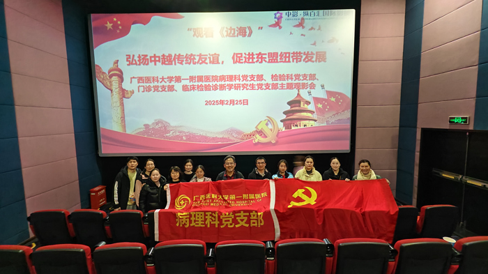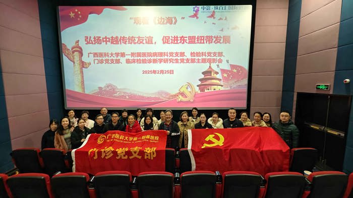 为促进中越文化交流,加深对中越友谊的理解,2月25日晚,检验科党支部、病理科党支部、门诊党支部及临床检验诊断学研究生党支部共同举办“弘扬中越传统友谊,促进东盟纽带发展”主题党日活动,60多名党员集体观看电影《边海》。