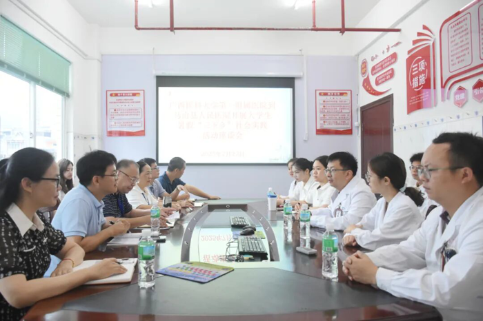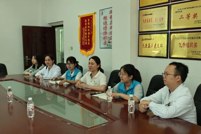 7月23日,实践团来到马山县人民医院座谈交流,马山县人民医院党委书记曾淑华、院长苏乃辉、总院派驻马山常务副院长云翔及与驻地医生、相关职能部门负责人与博士团座谈交流,详细了解马山县人民医院的基本概况、学科设置、人才结构、医疗服务水平和学生培养情况,未来在人才培养、科研等可合作的内容等。