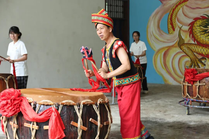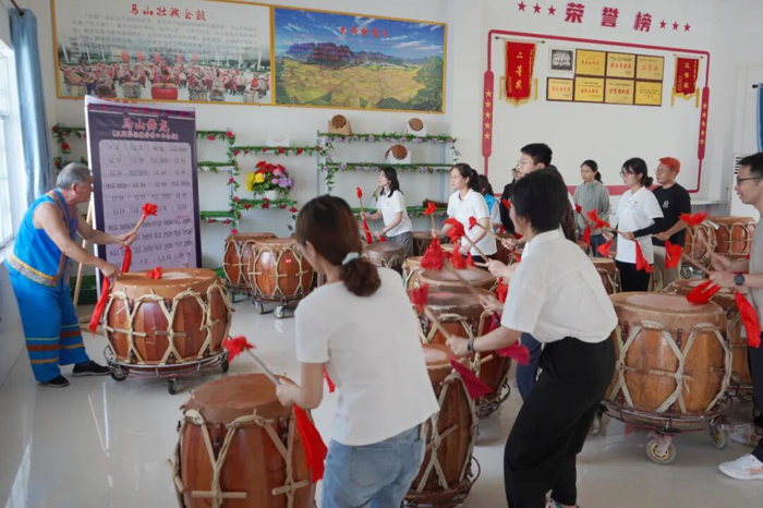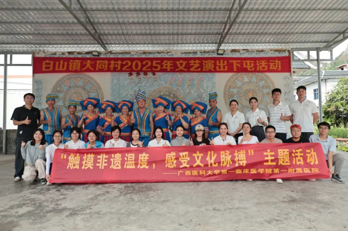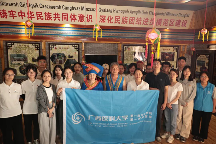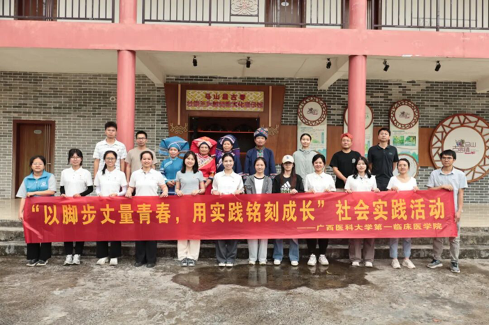 马山县是多民族聚居地,博士团注重开展“铸牢中华民族共同体意识”理论宣讲和非物质文化遗产研学活动,深入了解体验两项国家级非遗——壮族会鼓和壮族三声部民歌的传承与发展,把“非遗”搬进医学人文课堂。