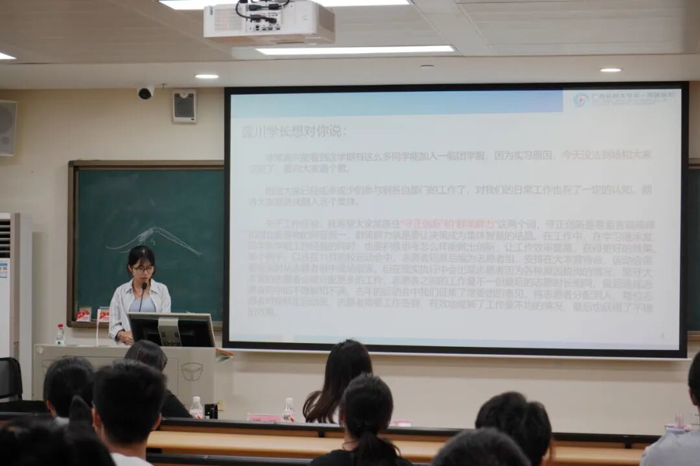 文体部前部长宁飞乔结合工作实际,分享了文体部工作经验与学习心得,并鼓励新一届成员加强与老师、学长学姐的沟通交流,在互动中积累经验、实现成长。