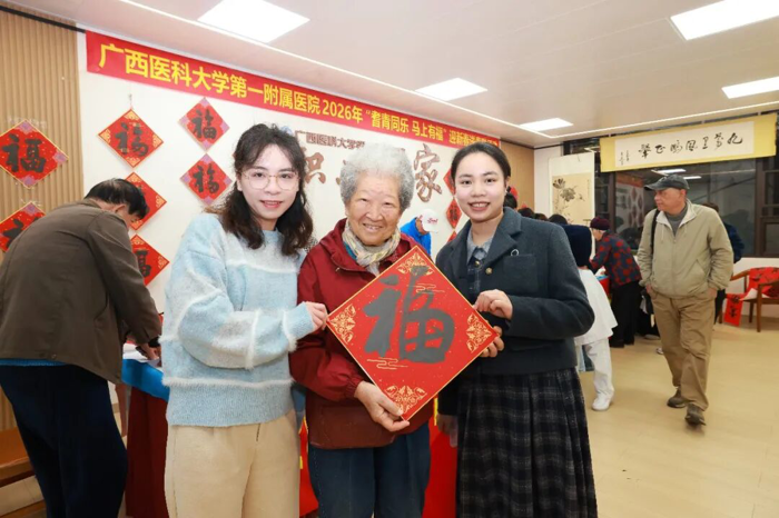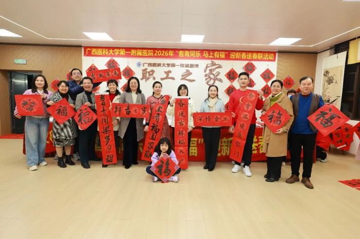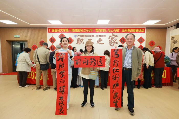 又是一年佳节至,笔墨迎春送福来。在农历立春节气之际,2月4日下午,广西医科大学第一附属医院“职工之家”活动室年味浓郁、喜气洋洋,2026年“耆青同乐 马上有福”迎新春送春联活动由离退休职工管理办公室、院团委联合在此举办。医院党委副书记莫新少,院党委副书记、工会主席赖铭裕等院领导出席活动,与离退休老专家、书法爱好者、青年医护志愿者们欢聚一堂,以笔墨送上祝福,以文化传递温情。