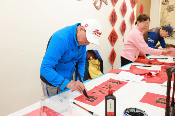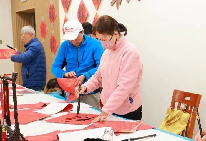 活动现场布置温馨,舒缓喜庆的音乐烘托出新春氛围,电视屏幕上滚动播放的离退休职工活动照片展现出他们老有所乐的精神面貌,而“集百福”文化墙则格外引人注目。