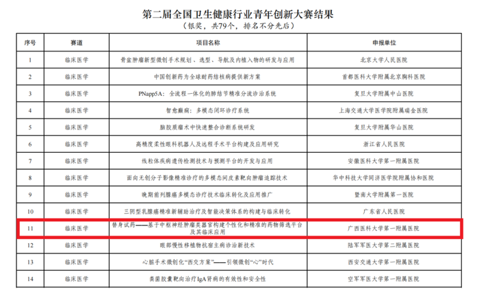 近日,由国家卫生健康委、共青团中央联合举办的中国青年创青春大赛卫生健康行业专项赛暨第二届全国卫生健康行业青年创新大赛落下帷幕。广西医科大学第一附属医院青年医务工作者的参赛项目从全国3632个参赛项目中脱颖而出,斩获银奖1项、铜奖1项,优秀奖2项的佳绩。