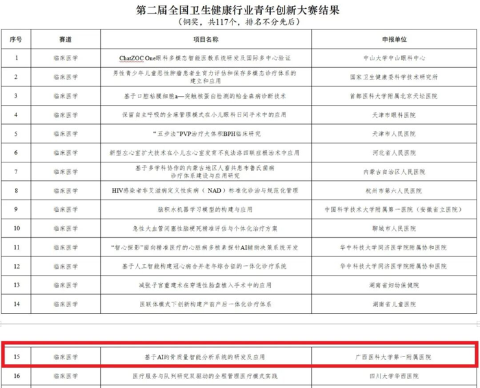 骨关节外科陈炎团队的《基于AI的骨质量智能分析系统的研发及应用》荣获临床医学赛道铜奖。