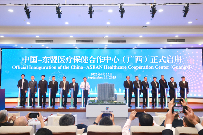 在位于广西南宁市青秀区江北大道73号的中国—东盟医疗保健合作中心(广西)5楼学术厅,广西医科大学第一附属医院收看了主论坛的启用仪式直播,随后举行了现场启动仪式,宣告中心正式运行。