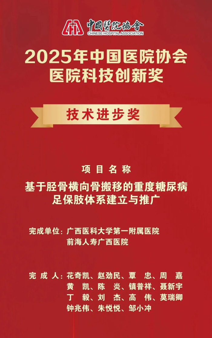 广西医科大学第一附属医院骨关节外科花奇凯教授作为第一完成人申报的《基于胫骨横向骨搬移的重度糖尿病足保肢体系建立与推广》项目研究成果,荣获2025年中国医院协会医院科技创新奖-技术进步奖,这也是本次评选产生的28项技术进步奖中广西唯一获奖的项目。我院党委副书记莫新少、赖铭裕带领党委办公室、护理部、骨关节外科等相关部门代表参会并领奖。