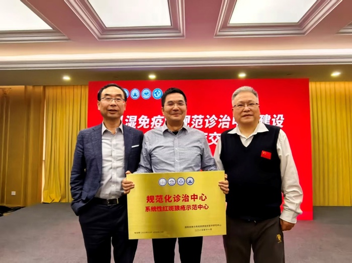 近日,我院风湿免疫科获评国家皮肤与免疫疾病临床医学研究中心(NCRC)“系统性红斑狼疮(SLE)规范化诊治示范中心”。授牌仪式在NCRC规范化诊疗中心建设项目会议(COE)上举行,全国仅9家单位获示范中心授牌,我院是广西唯一获得示范中心授牌的单位,标志着我院风湿免疫的学科建设与诊疗能力再上新台阶。我院风湿免疫科主任莫汉有教授参会,NCRC主任曾小峰教授、中华医学会风湿病分会主任委员李梦涛教授为我院授牌。