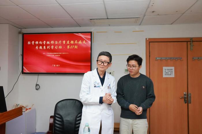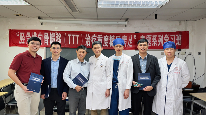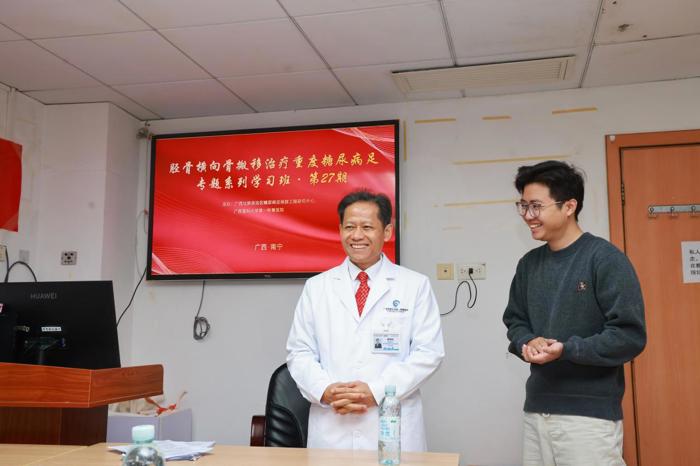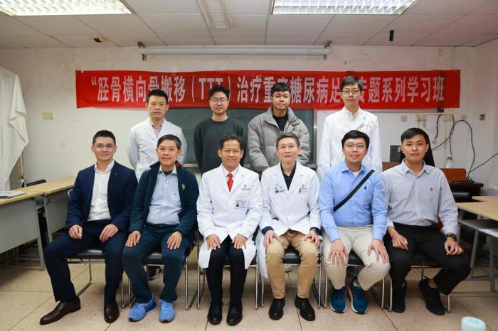 12 月 15—19 日,我院圆满主办第 27 期“胫骨横向骨搬移(TTT)治疗重度糖尿病足” 专题系列学习班。来自越南胡志明市医药大学(University of Medicine and Pharmacy at Ho Chi Minh City)的医学博士DO PHUOC HUNG副教授、PHAN BA VU DONG、TRINH LE HUNG VUONG,还有越南 FV 医院的 TRUONG HOANG VINH KHIEM,以及山西中铁十七局中心医院的申志栋等5位医师齐聚绿城南宁,深入学习这项国际领先的保肢技术——胫骨横向骨搬移(以下简称“TTT技术”)。