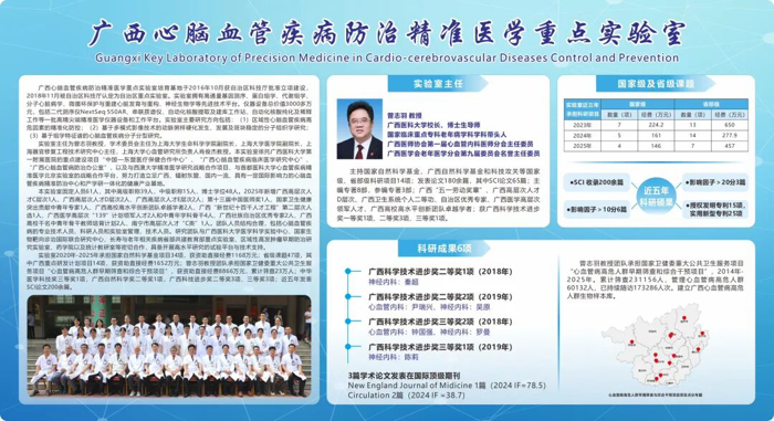 实验室坐落于我院临床教学楼,拥有合理的人才梯队,现有其中高级职称39 人,中级职称 15人,博士学位 48人。实验室科研成果显著,在2020-2025年间累计承担国家自然科学基金项目34项,省级课题47项。曾志羽教授团队承担的国家卫健委重大公共卫生服务项目“心血管病高危人群早期筛查和综合干预项目”,累计筛查23万人。期间荣获包括广西科技进步奖二等奖在内的多项奖励,并发表SCI论文200余篇,显示出强劲的科研实力与区域影响力。
