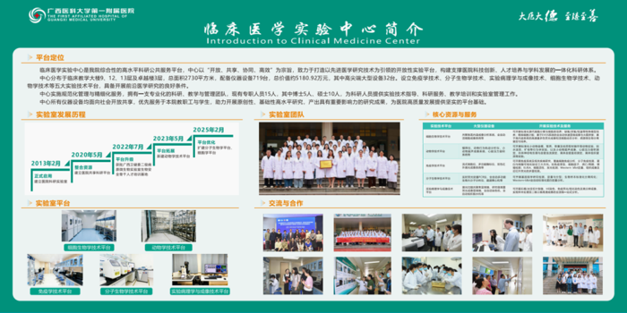 为顺应医学科技发展与健康中国战略需求,破解科研资源分散、服务单一、共享不足等难题,我院整合优势资源成立了临床医学实验中心。中心秉持“开放、共享、协同、高效”的宗旨,着力构建覆盖多技术维度、支撑全链条研究的一体化科研服务体系。2013年2月正式启用,2020年升级为共享平台,2022获批“广西卫健委二级病原微生物实验室生物安全骨干人才培训基地”,2023年新建动物学技术平台,2025年扩建分子与细胞平台,不断提升专业服务能力。