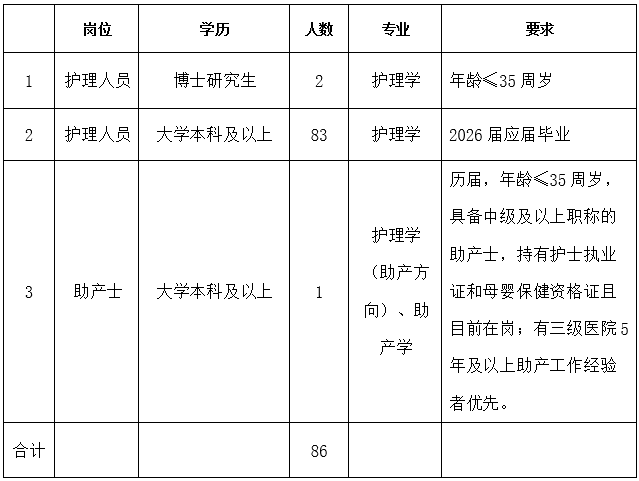 根据医院工作需要,现招聘护理人员86名,具体如下: